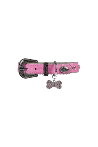 Tooled strap, beaded edging, diamante studs, metal D-ring, diamante dog bone tag, Pure Western concho, silver hardware