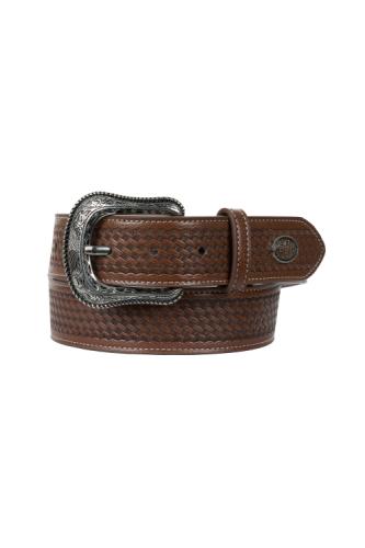 Tooled basketweave strap; contrast tab edge; diamond shaped conchos; removable buckle; Pure Western concho; antique silver hardware