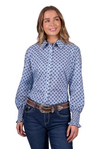 Classic button through long sleeve shirt; button closure; extra button at bust; shirred detail on sleeve hem; gathering detail at sleeve head; Pure Western logo pip on side seam; light weight fabric with soft hand feel