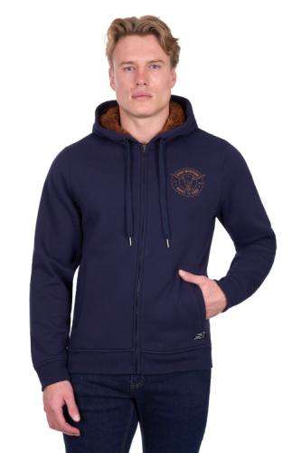 Heavyweight brushed fleece hooded jacket, contrast sherpa hood lining for warmth, front welt pockets, rib trim pockets, hem and cuffs, Pure Western logo hem label, back neck logo print, small chest print