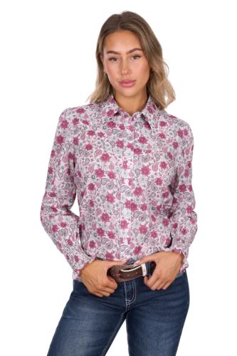 Fashion style button down long sleeve shirt, original hand drawn paisley print, button closure, extra button at bust, western front and back yokes, gathering detail on sleeve head, Pure Western logo pip on side seam, lightweight fabric with soft handfeel, western back yoke, shirred detail on sleeve hem