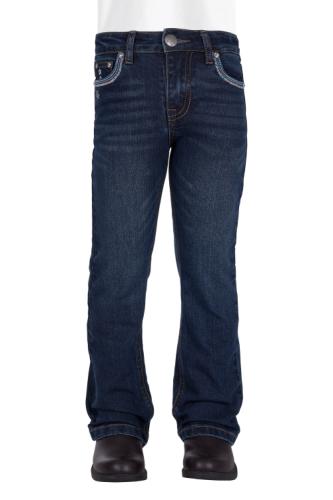 Boot cut, stretch for comfort and movement, mid rise, adjustable elastic waistband on all sizes, logo shank button, diamanté rivets, woven logo label on back yoke, feature embroidery on back, front and coin pockets, PW embroidery on front pocket, contrast all over topstitch